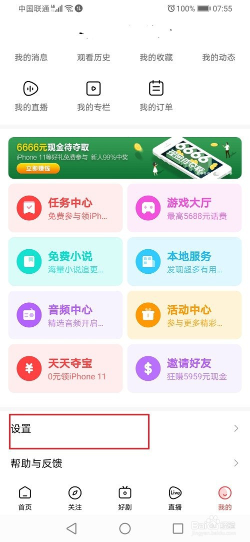 第一步进去都雅视频我的界面,点击设置,如下图所示: