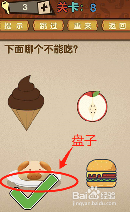 第8关:下面哪个不克不及吃?点击盘子,因为盘子不克不及吃,注重点击到“小猪”是没用的,要点到盘子上。