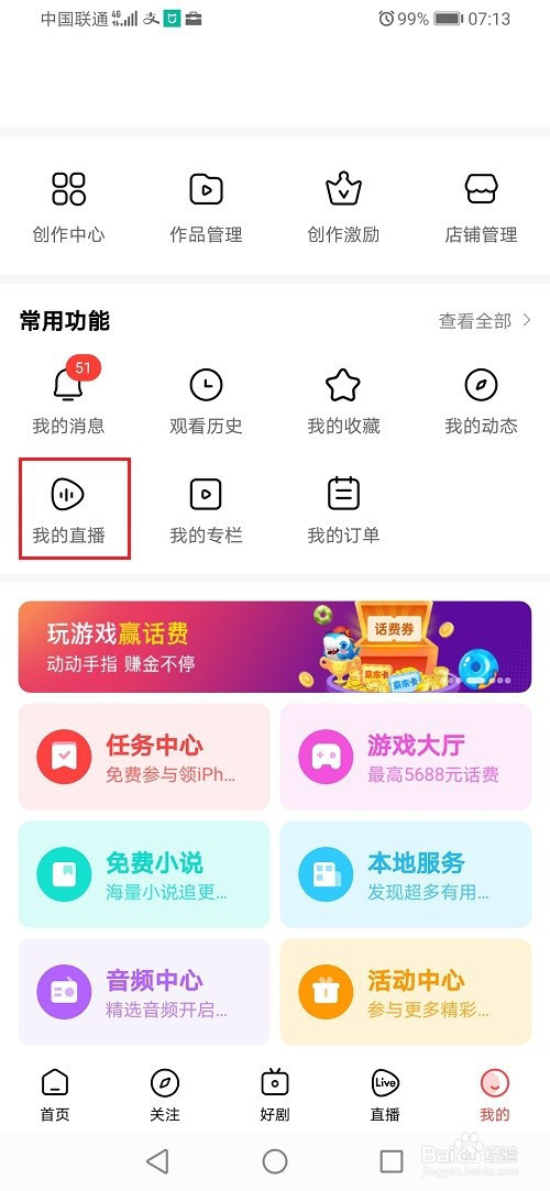 第二步进去都雅视频之后,点击我的直播,如下图所示: