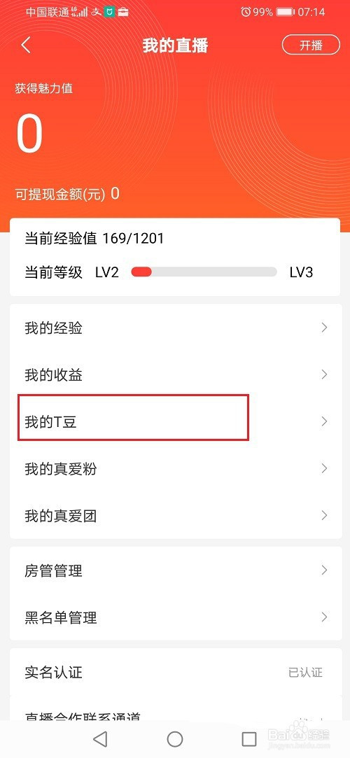 第三步在我的直播中,点击我的T豆,如下图所示: