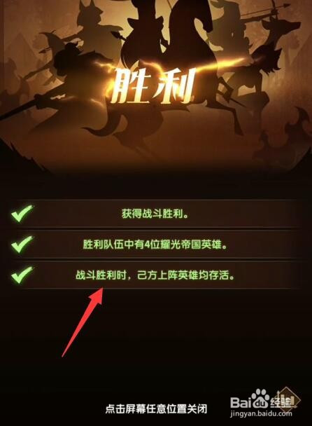 这一关的三星攻略是获得战斗胜利。胜利步队中有4位耀光帝国英雄。战斗胜利时,己方上阵英雄均存活。