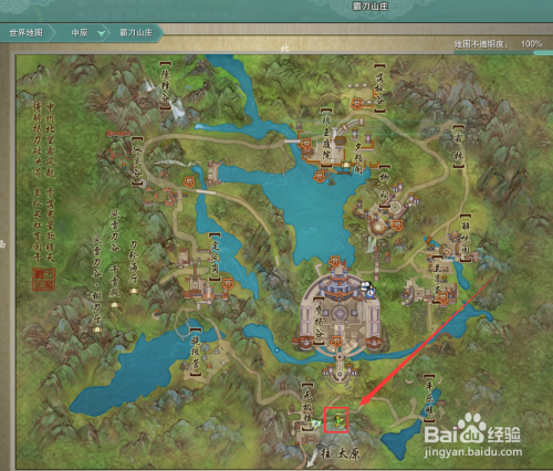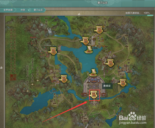在打开的宿世界地图中,点击【霸刀山庄】地图。