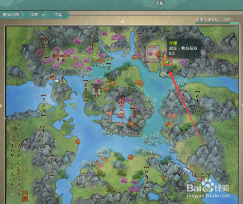 达到丐帮地图后,从神行点飞到以下三处红框位置中肆意一处获取对应使命触发物品。【一篓银鱼】3个或【一包杏花饼】3个或【桃花枝】3个。