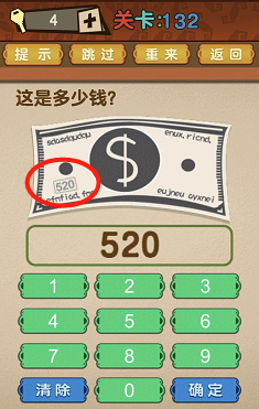 最强的大脑第132关:这是几多钱?谜底【520】让屏幕朝下就可以看到钱上的水印,然后输入水印“520”