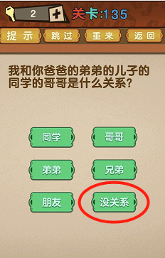 最强的大脑第135关:我和您爸爸的弟弟的儿子的同窗的哥哥是什么关系。谜底【不妨】