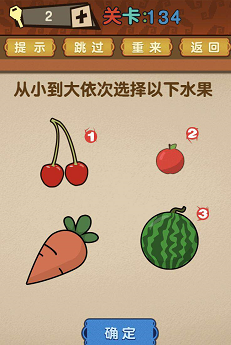 最强的大脑第134关:从小到大依次选择以下生果。谜底【樱桃--苹果---西瓜】注重萝卜不是生果,别被误导