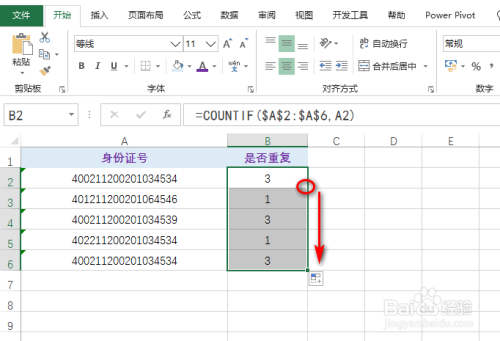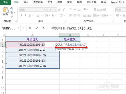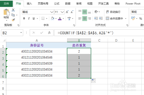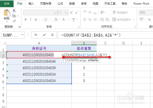 可以看到此中有一个身份证号的最后几位并不不异,可是因为excel进行默认的前14位进行统计,所以会呈现这种误差,这里点窜公式为:=COUNTIF($A$2:$A$6,A2&"*"),具体如图所示:
