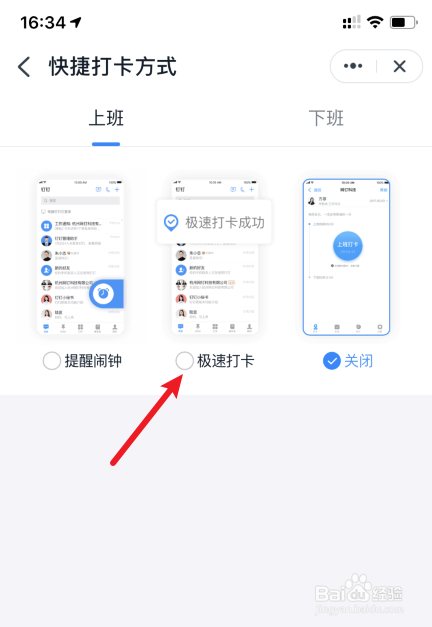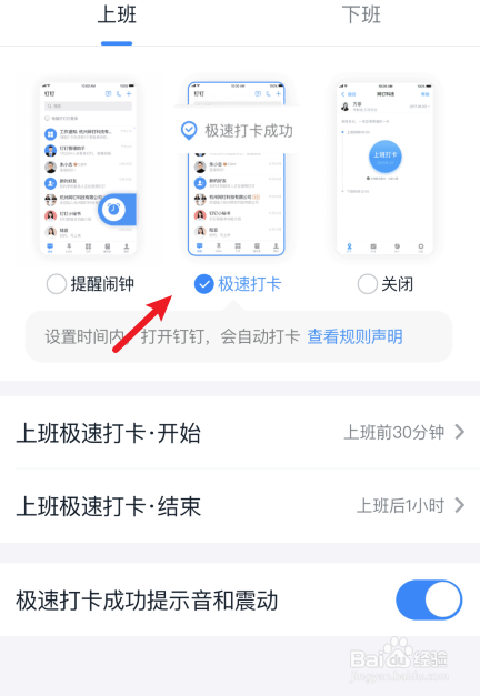 点击进入后,选择上班或者下班,并点击极速打卡。