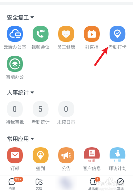进入钉钉应用后,在工作台内,点击考勤打卡的图标。