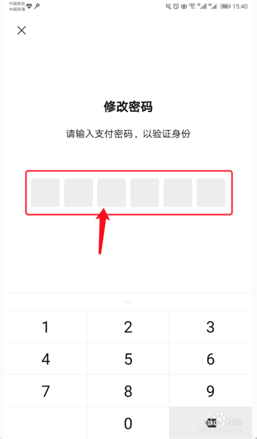 在弹出的页面中,输入本来的支付密码,如下图所示。