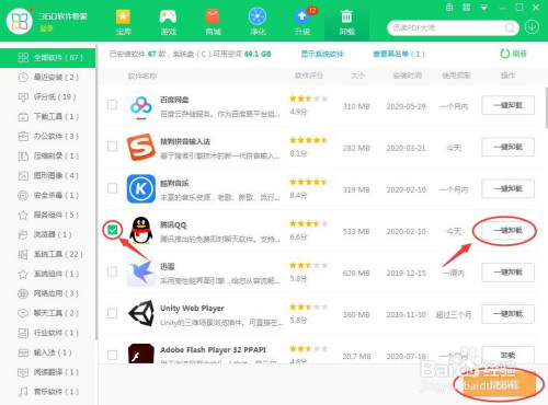 好比想要卸载腾讯QQ,可以直接在厥后面直接点击“一键卸载”,或者选中腾讯QQ前面的复选框,然后点击页面右下角的“一键卸载”。