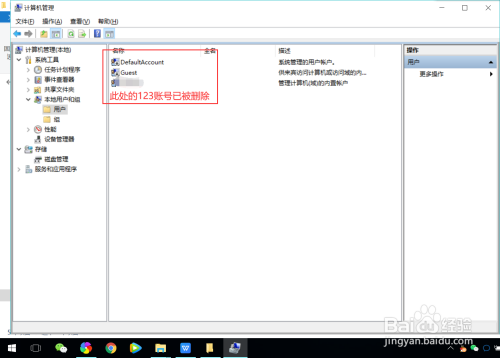 然后在中心位置的名称下,双击“用户”文件夹,进入用户办理页面,我们可以看到用户界面的“123”用户已经被删除;