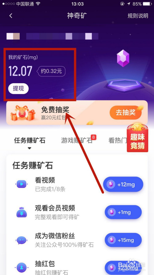 2.点击神奇矿,再点击进入我的矿石选项下的提现。