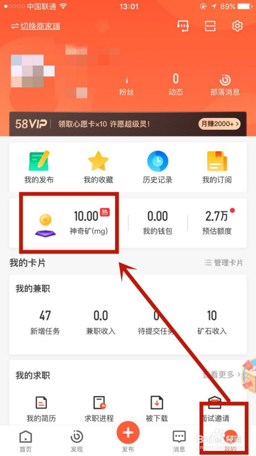 点击58同城首页右下角的我的,再点击神奇矿选项进入。