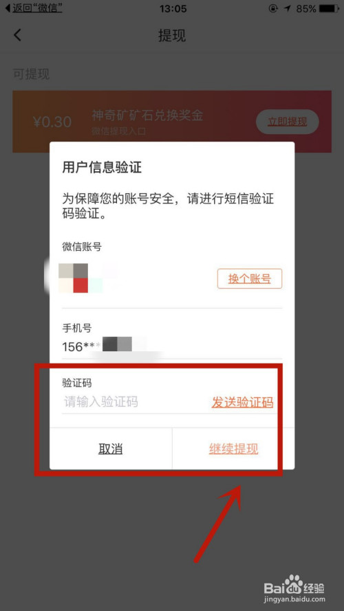 5.输入手机号接收的验证码后,点击继续提现选项。