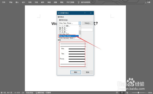 打开界说新编号格局,选择编号样式,选中one、two、three选项,确定