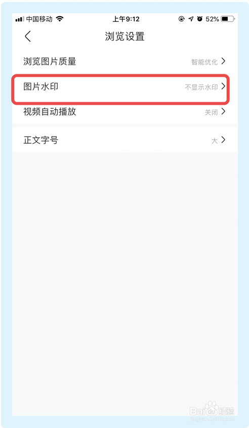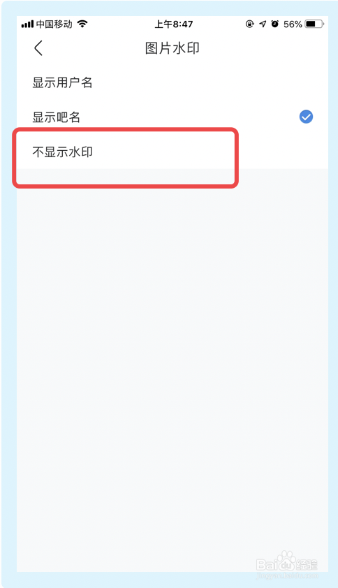 5.点击【不显示水印】选项,完当作以上步调百度贴吧app即可设置图片不显示水印功能。