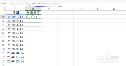 输入函数公式:=INT((MONTH(A2)-1)/3)+1
