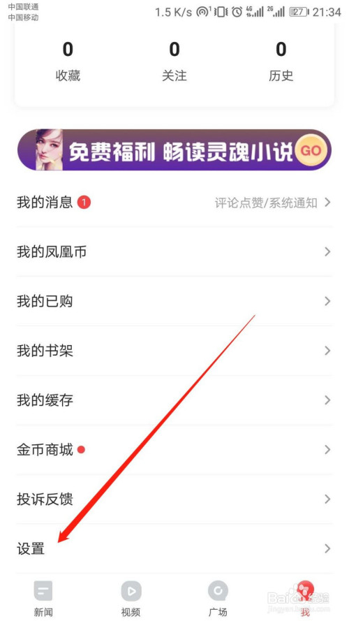 “凤凰新闻”APP本家儿页点击右下角“我”。如图: