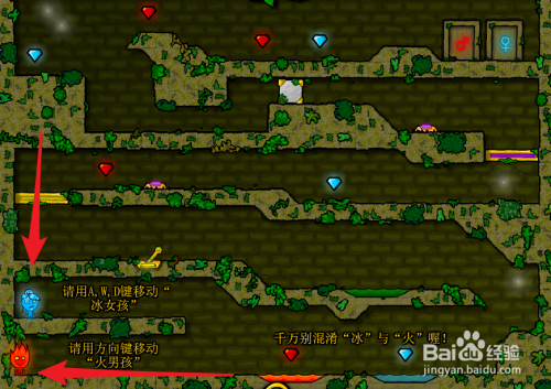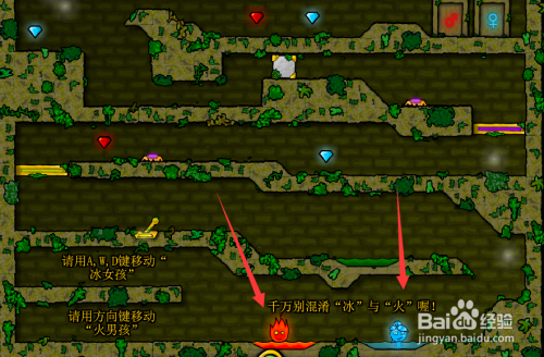 冰女孩可以从冰海经由过程,可是不克不及碰着火海,碰到火海需要按住W键和D键跳偏激海,火男孩不克不及碰着冰海可以经由过程火海