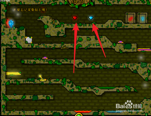 游戏里有砖石,砖石可以增添游戏的分数和品级,必然不要拉下,红色的砖石是火男孩的,蓝色的是冰女孩的