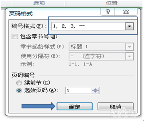 6.在弹出的页码格局对话框中,可以选择编号格局,起头的页码数,点击确定,页码就设置好啦