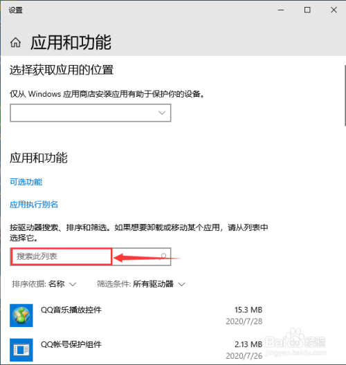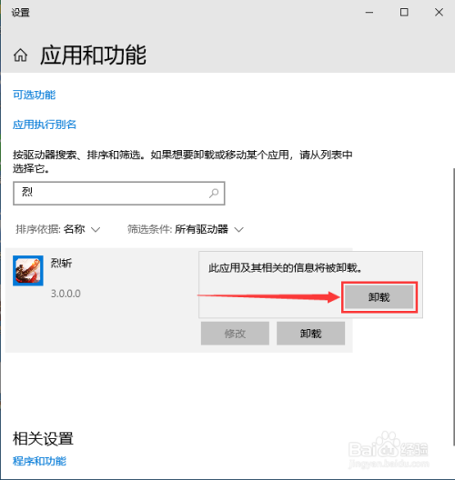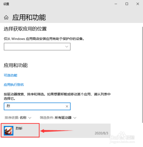 在“应用和功能”页面下,在“搜刮此列表”处输入关头字“烈”。见下图