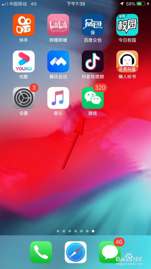 在手机软件中找到并登岸微信,如下图箭头所指位置