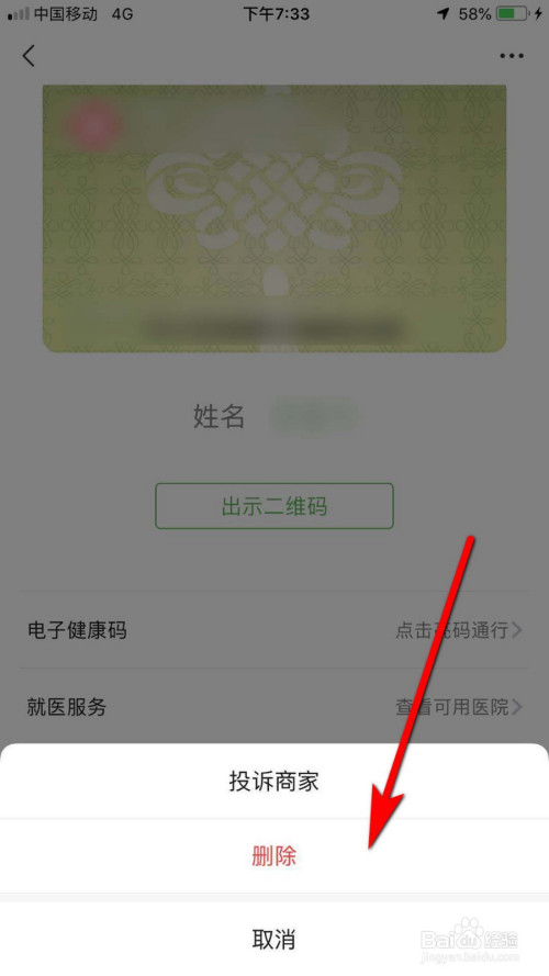 在睁开的菜单中找到删除,点击删除即可完当作刊出删除健康码