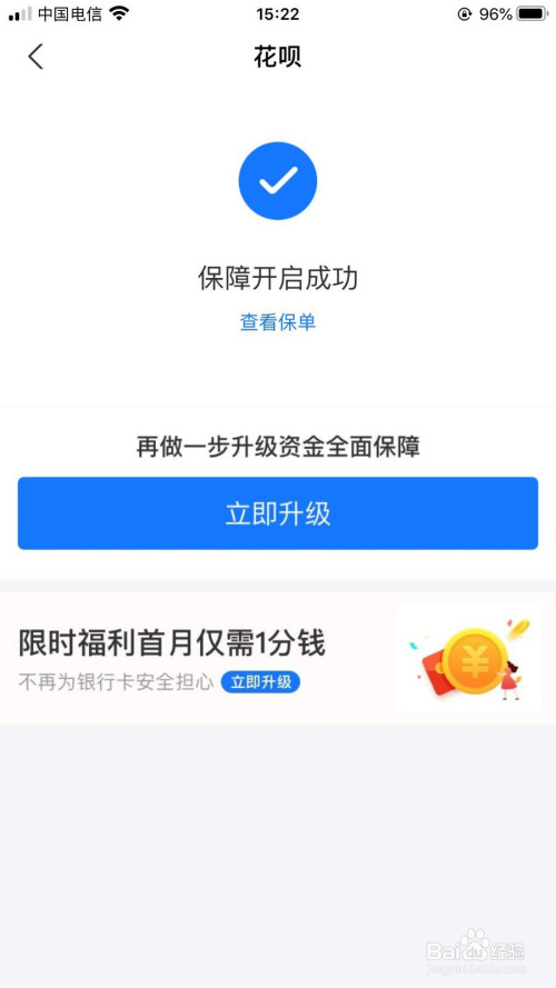 在“花呗”页面中,看到“保障开启当作功”的字样提醒即可。