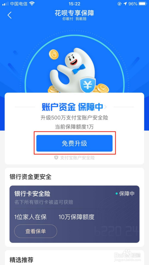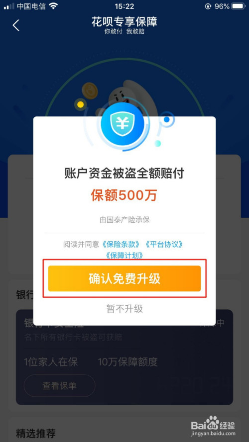 在“账户资金被盗全额赔付”的面板中,点击“确认免费进级”按钮。