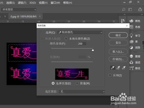 利用吸督工具切确选择待处置图案的颜色,单击确定回到本家儿页面,此时呈现一个选区。再利用快捷键“Ctrl+J"新建一个图层;