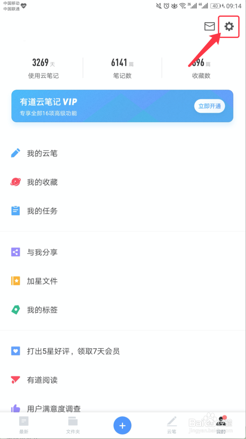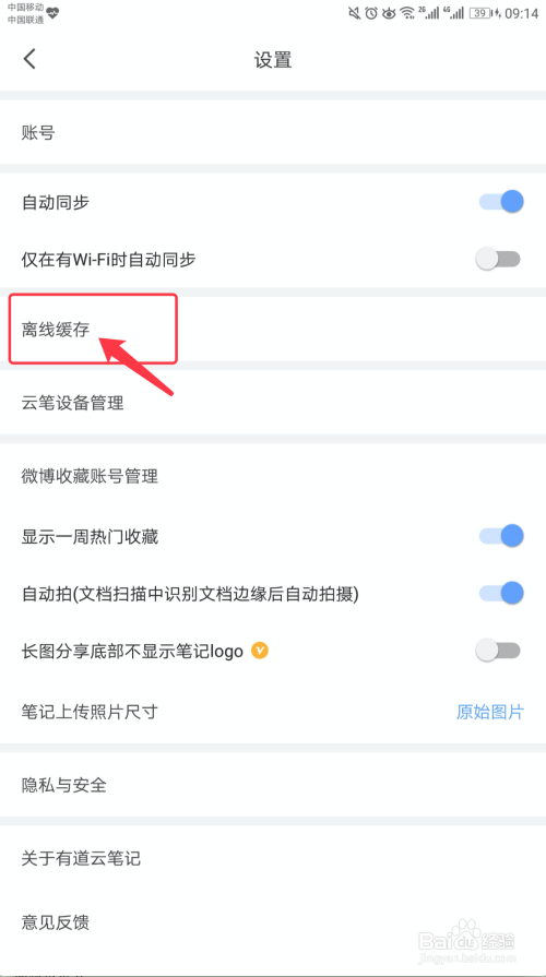 总结:点击「有道云笔记」->点击【我的】->点击【设置】图标->点击【离线缓存】->点击对应的【开关按钮】。