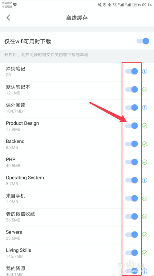 在【离线缓存】中,点击文件夹右侧的【开关】按钮,如下图所示。