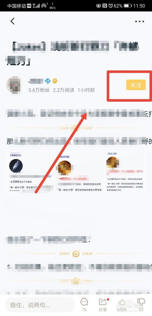 2、方式1,点击进入某文章,在文章页面存眷作者,选择三个分歧作者存眷即可;