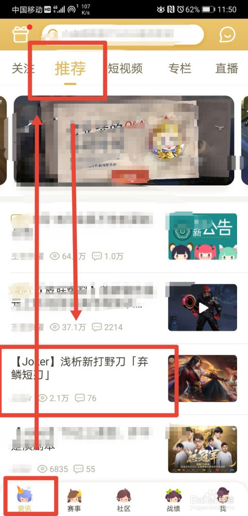 方式1,我们打开王者营地app,在首页(资讯)、保举页面下,打开肆意文章,点击进入;