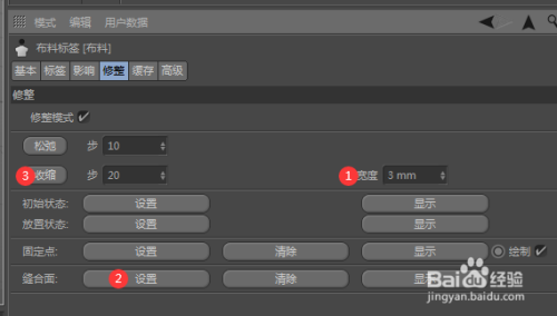 4、点击立方体对象后面的布料标签图标,在属性面板中,我们将宽度的数值点窜为3mm,点击“缝合面”后面的“设置”选项。此时立方体的Y轴就形当作了一个缝合面,再点击“缩短”选项。