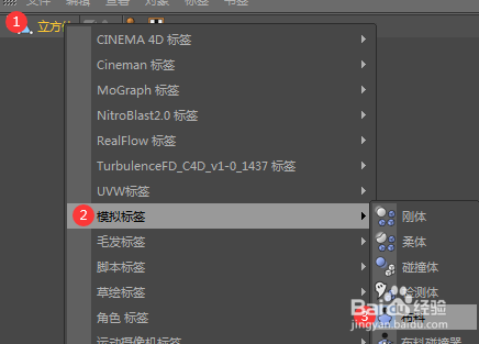 3、在对象面板中选中立方体对象,右键选择“模拟标签”-“布料”为立方体对象添加一个布料标签。