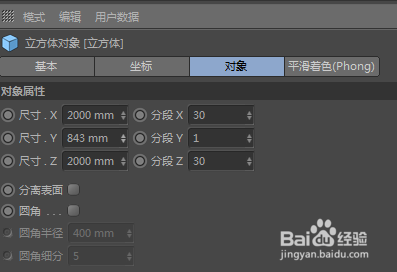 1、打开C4D软件,在对象框中选择并建立一个立方体对象,在属性面板中将立方体的Y轴的尺寸降低,同时将X轴、Z轴的分段数设置为30。