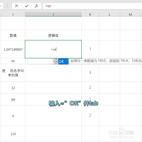 在方针单位格中输入“=OR”然后按下Tab,只要提醒中第一条是您想要的函数就可以直接按Tab让系统补全