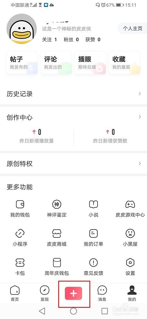 第二步进去皮皮虾我的界面,点击中心的+号图标