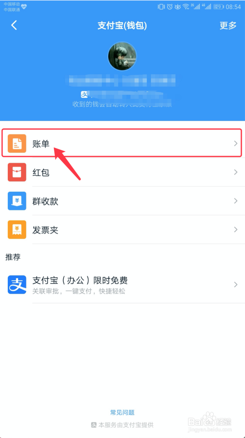 在【支付宝(钱包)】页面中,点击【账单】,如下图所示。