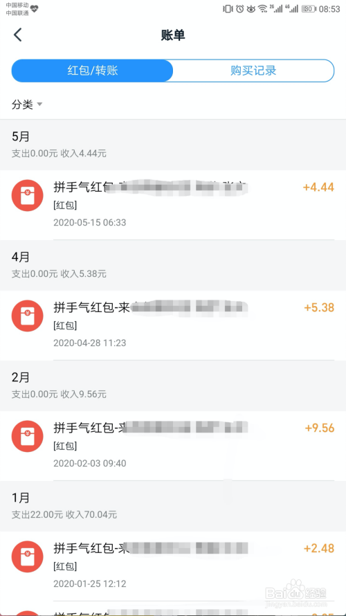 在【账单】页面中,就可以看到【红包/转账】的账单信息了,如下图所示。
