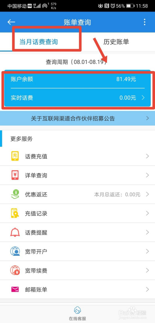 进入账单查询页面后,在当月话费查询页面即可看到当月账单详情;