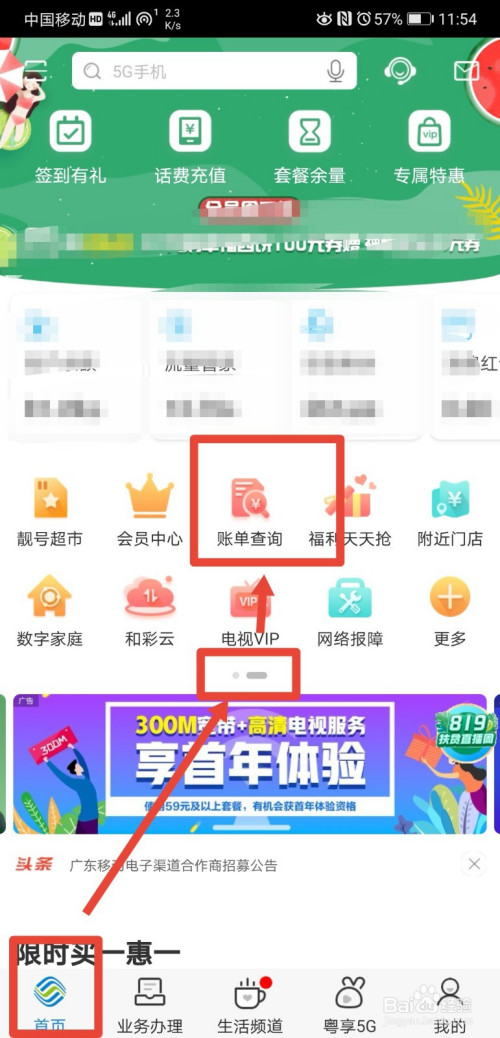 登录当作功后,我们有两种方式进入账单查询页面,方式1,在首页常用功能中找到账单查询功能,点击进入;