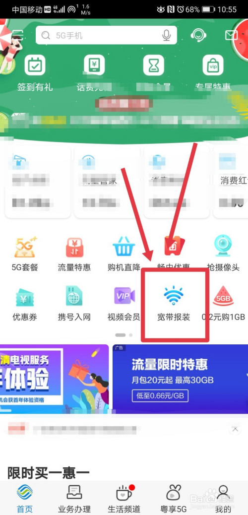 当作功登录app后,在首页找到宽带报装功能,点击进入;