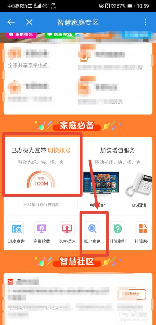 进入到宽带办事页面后,可以看到已打点的宽带信息为100M带宽,详情如下,然后我们再点击进入账号查询功能页面;