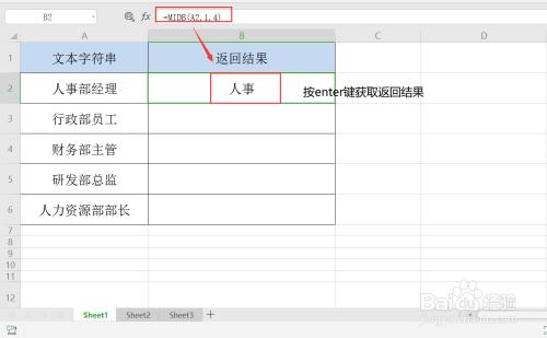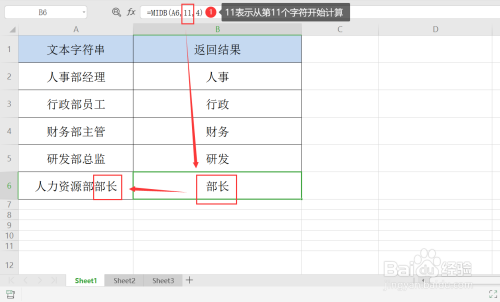 第六步,假设我们要截取字符串“人力资本部部长”中后两个汉字“部长”,那我们将公式改为=MIDB(A6,11,4)即可。