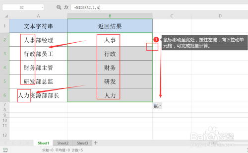 第三步,完美公式=MIDB(A2,1,4),意为利用函数截取A列中前两个汉字,A2暗示A列中的文本内容,1暗示起头文职,4暗示字符个数,一个汉字为两个字符,4即暗示截取两个汉字;