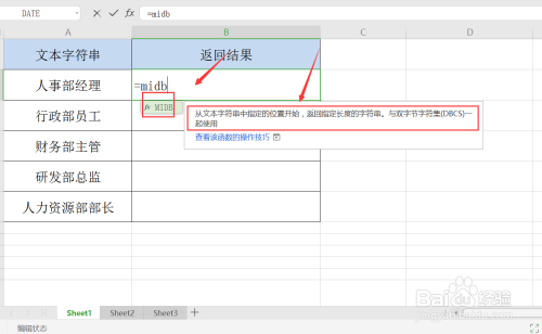 第二步,单位格中输入函数=MIDB,领会其利用法则;